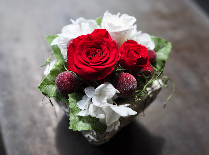 店長がおすすめするワイヤー製花器のプリザーブドフラワーです。