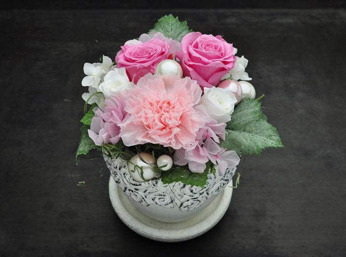 店長がおすすめするワイヤー製花器のプリザーブドフラワーです。